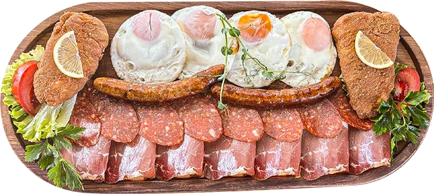 (4 jaja, 2 ćureće kobasice, sir, pršut, kulen, pohovane paprike)